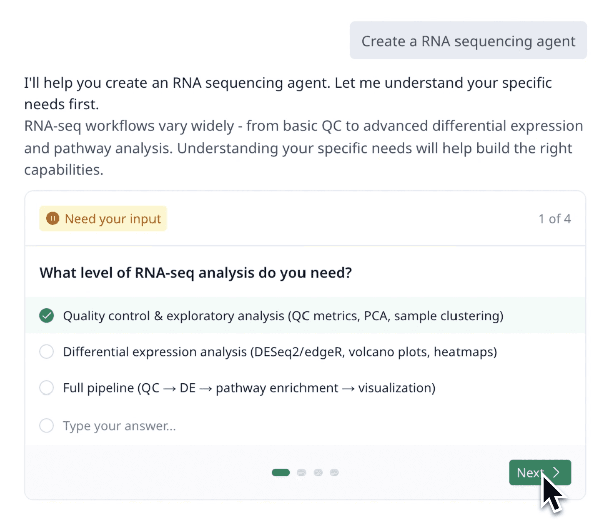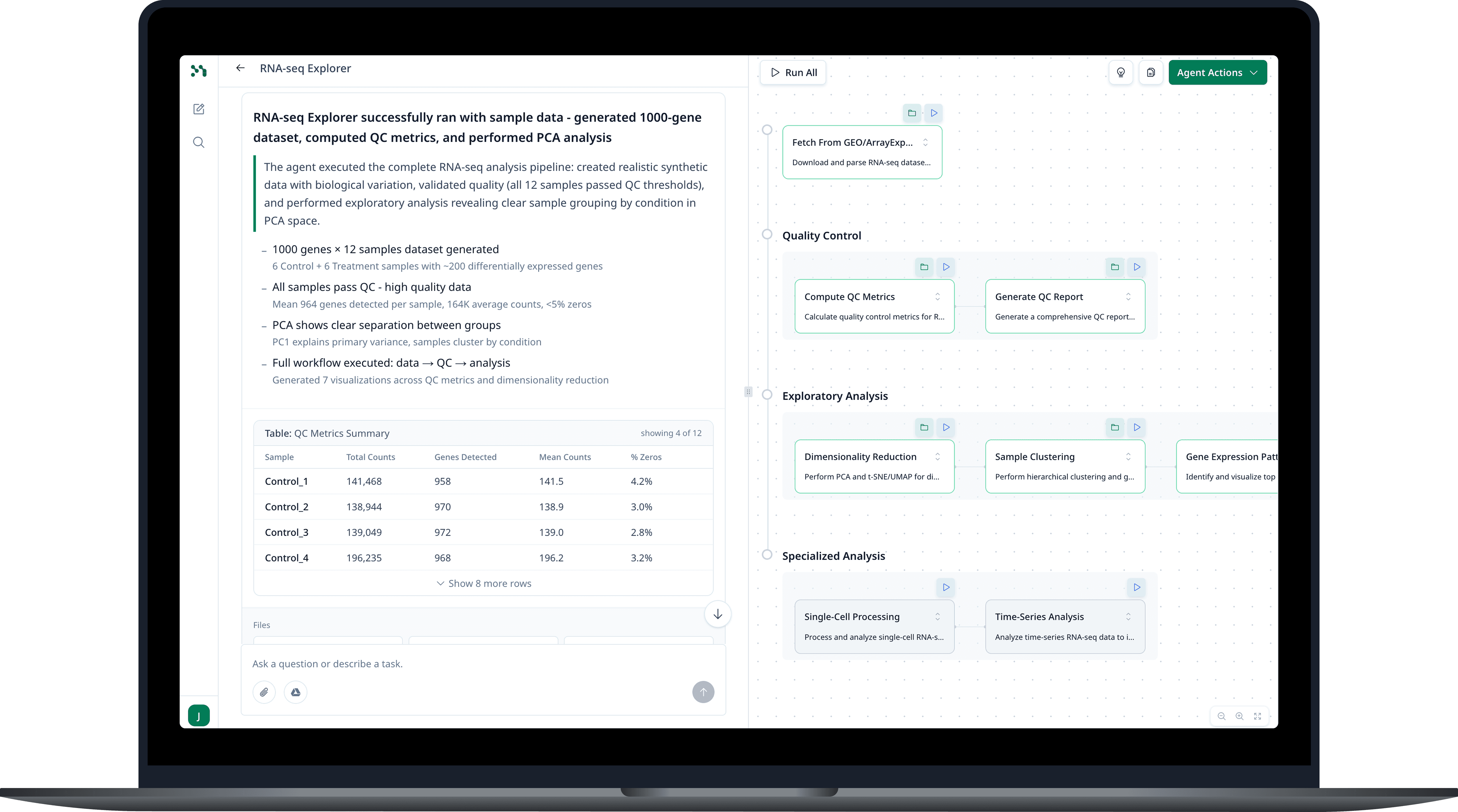 In most AI tools, users ask a question and receive an answer, but the “how” is buried in generated text. Scientists need an audit trail and the ability to point to exact methods, parameters, and data sources for peer review and compliance.