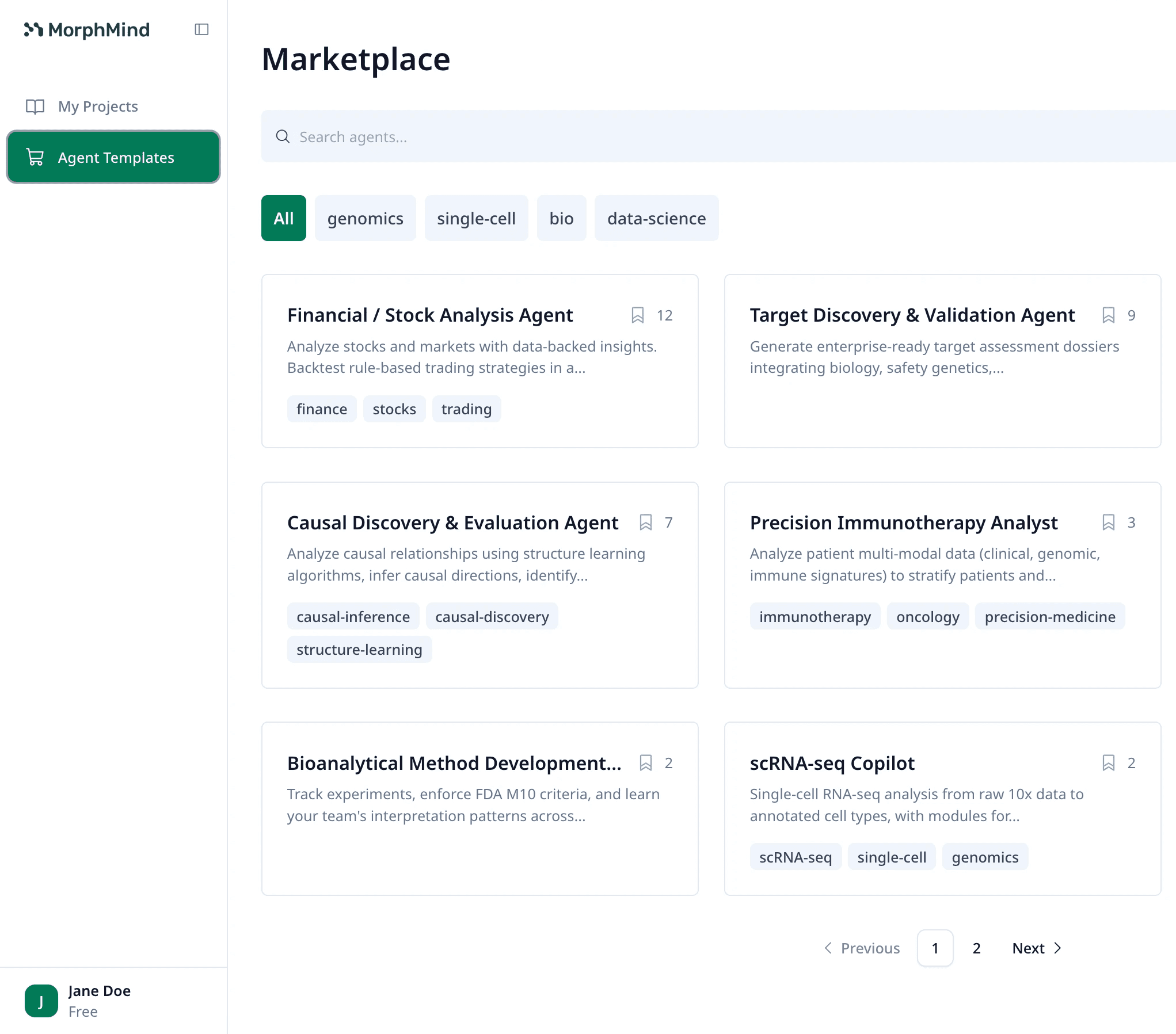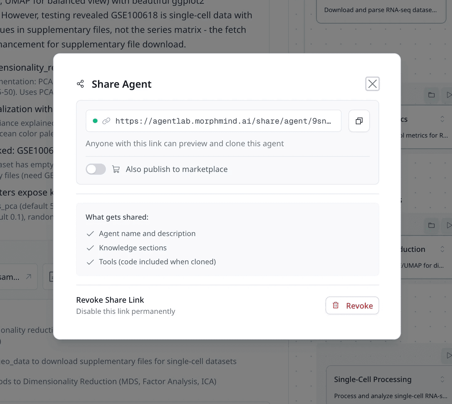 Once the platform stabilized, we introduced agent sharing, allowing users to publish their agents to the marketplace for public use or share them privately with their lab members.