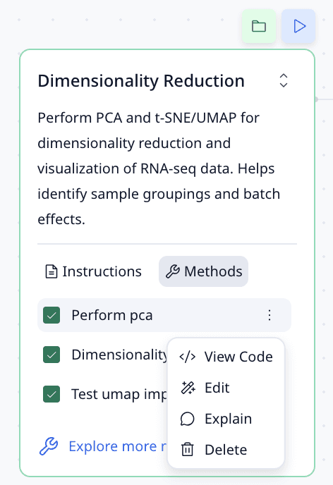 I redesigned the workflow view to reflect how scientists reason about experiments: steps are grouped by stages, with high-level flow visible at a glance. Users can click into nodes for detailed methods, parameters, and code.