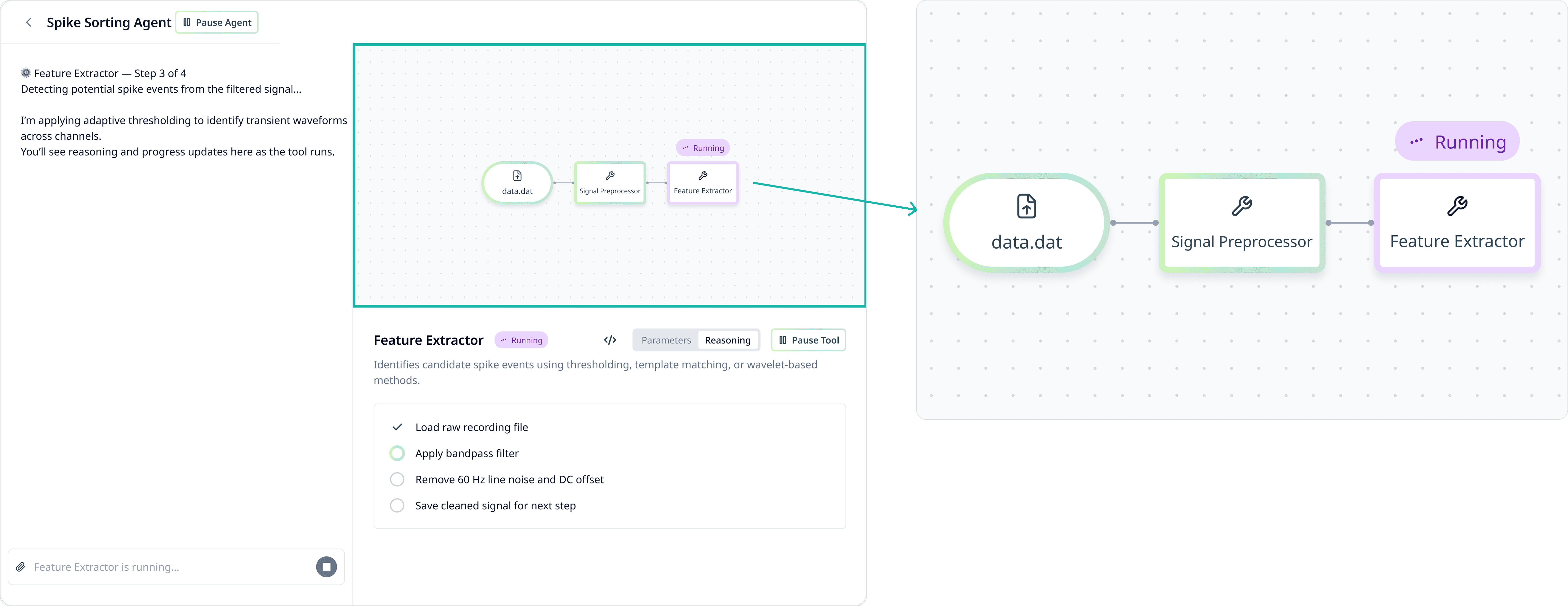 As the agent runs, its workflow materializes in real time as a hierarchical node map. Each node represents a discrete scientific step and includes the instructions and methods, providing users with a traceable audit trail.