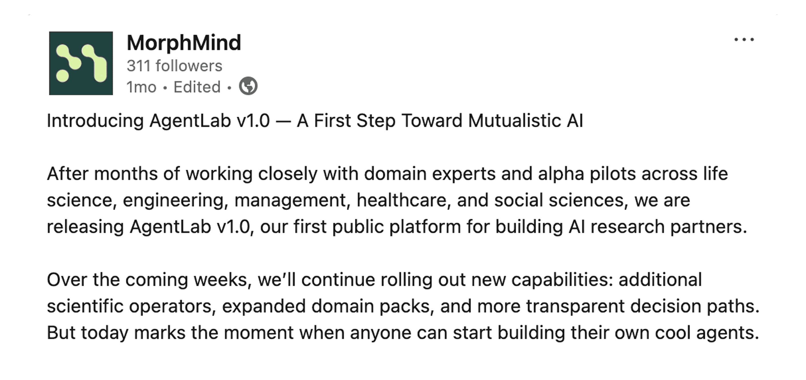 The product was launched in Dec 2025. Try it here: https://agentlab.morphmind.ai